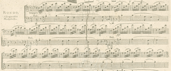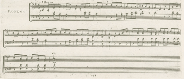 For most of his early career, Beethoven played on German and Viennese pianos. With the light action, clear attack, and rapid decay of these instruments, he composed themes such as this, from the concluding movement of Op. 49, No. 1: